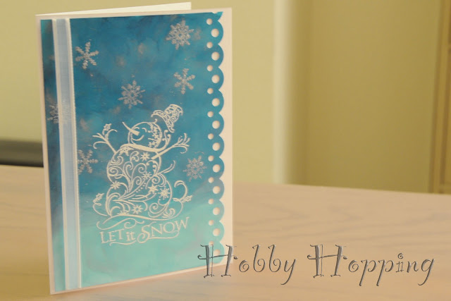 First I have this snowman card, made with a whole bunch of my new stuff. The background was made with Alcohol inks (Denim, Stream, Pool, and Silver Mixative) on glossy cardstock. The snowman and snow flakes are from that gorgeous set of stamps I bought last week. I heat embossed the snowman, then I stamped the snowflakes with glue and sprinkled them with silver glitter.